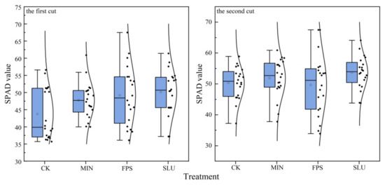 As shown in Table 2, compared with the non-fertilization control (CK), the cumulative biomass of the alfalfa under all the fertilizer treatments was significantly higher, and the biomass of alfalfa in two seasons increased by 16.40% to 36.36% on average. Under the same amount of N application (90 kg·ha−1), the biomass of the alfalfa treated with dairy cattle slurry (FPS, SLU) was not significantly different from that treated with a single mineral fertilizer N (MIN) when the first season was harvested. However, the biomass of the alfalfa treated with dairy cattle slurry (FPS, SLU) was significantly higher than that treated with a chemical fertilizer when the second season was harvested. The application of dairy cattle slurry had a significant effect on the alfalfa biomass.