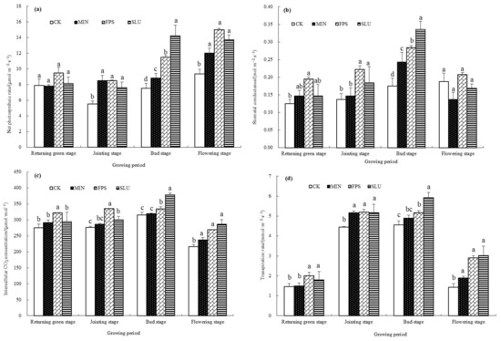 To ensure that the same part of the leaf was measured each time, we selected the middle of the fourth fully unfolded blade from the top down. A photosynthometer (LI-6400XT, LI-COR, Lincoln, NE, USA) was used to determine photosynthesis, including the net photosynthetic rate (Pn), stomatic conductivity (Gs), intercellular CO2 concentration (Ci), and transpiration rate (Tr), on a clear and wind-free day from 9:00 am to 11:00 am for each growth stage.