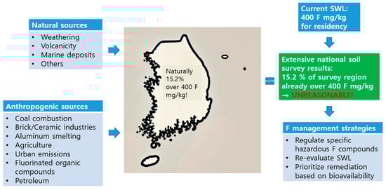 To address this question, we first reviewed the current literature to explore the sources and behavior of fluorine in the soil. Subsequently, we examined the soil fluorine content regulation strategies adopted by various countries. Next, we summarized the current challenges in managing soil fluorine in Korea. Based on this comprehensive study, we offer perspectives on soil fluorine management strategies in Korea (Figure 1).