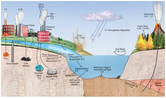 The main natural and human–caused movements of fluorine around the globe, measured in Tg F/yr. (Schlesinger et al. [18], with the permission of authors.)