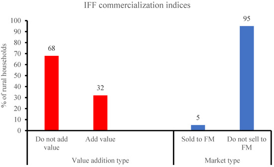 Figure 2 presents two indicators of commercialization (market type and value addition) to assess IFF commercialization status in the study area. In this regard, the status of IFF commercialization is analyzed based on the fraction of rural households that exploit commercialization indicators of selling IFFs to the formal market and adding value to their IFFs.