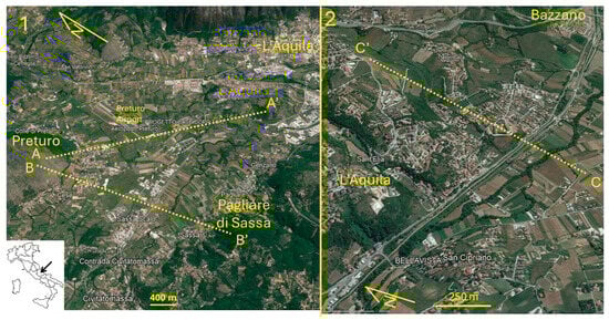The study area of Preturo–Sassa (1) and Bazzano–Monticchio (2) (L’Aquila Municipality). The dotted yellow lines refer to sections A-A’, B-B’, and C-C’. In both sites (i.e., the Preturo airport and nearby Bazzano), 2D microtremor arrays were acquired.
