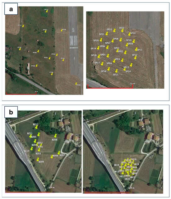 (a) Vs array geometry for the Preturo site. (Left): array BA geometry with 12 stations; (right): array SA geometry with 24 stations. (b) Vs arrays geometry for the Bazzano site. (Left): array BA geometry with 12 stations; (right): array SA geometry with 24 stations.