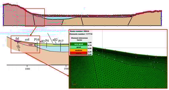 In this case study, the mesh generation was built with an adaptive approach so as to preserve computational resources in favor of the control points identified for obtaining the output results. The mesh step would increase from higher values starting from bedrock (equal to 4 m) and then level off at lower values (equal to 1 m) in the proximity of the control points. The overall balance is expressed by the following system of Equation (3).