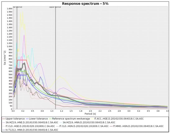 In choosing them, based on the target spectrum, the following characteristics of the selected seismic events and recording sites were considered: (i) magnitude earthquake (Mw or Ml—interval): 5.5—7; (ii) focal mechanism: extensional fault; (iii) epicentral distance from the recording site: 0–30 km; (iv) recording site on seismic bedrock. Moreover, the used tolerance criteria between the target spectrum and the average value of the seven selected recordings are (i) period range considered for comparison: 0.1–1.1 s; (ii) upper tolerance: 30%; (iii) lower tolerance: 10%.