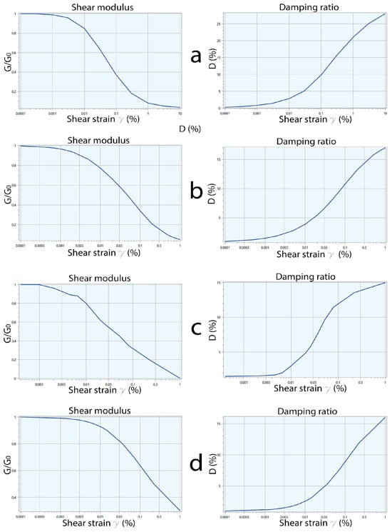 Decay curve G/G0–shear strain γ (%) (left) and damping curve D–shear strain γ (%) (right) obtained from: (a) sand model (upper–lower) by [41]; (b) gravel medium model by [42]; (c) resonant column and cyclic torsion test on sample S3 C3 (silty clay) sampled in the borehole S3 at 17.5–18.0 m bgl (Cese Preturo) [43]; (d) model by [44].
