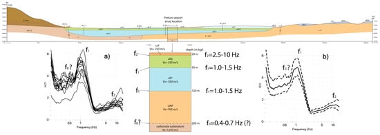 Figure 8 illustrates the HVSR plots of the Bazzano array (12 stations configuration); f0, f1, and f2 resonance frequencies can be noted for 0.4 Hz, 0.8–2 Hz, and 4–5 Hz, respectively. Furthermore, two-dimensional array measurements enabled us to estimate the shear wave velocity profile for this area (Figure 9).