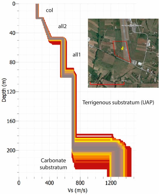 The data array processing based on the joint inversion of dispersion and H/V curves made it possible, in the Preturo airport site, to reconstruct the shear-wave velocity (Vs) versus depth profile. The profile highlighted a series of sharp Vs changes which may have correspondence with the geological setting (Figure 7): (i) at 20 m bgl, the boundary between col (Vs = 250 m/s) and the underlying unit at1/all2 (Vs = 450–500 m/s); (ii) at 50 m bgl, the boundary between all2 (Vs = 450 m/s) and the underlying unit all1 (Vs = 800 m/s); (iii) at 100 m bgl, the boundary between all1 and the geological substrate made up of UAP (Vs = 700–800 m/s); (iv) at 200 m bgl, the boundary, within the geological substrate, between UAP-UAM and the carbonate units (Miocene CBZ or Mesozoic units) (Vs = 1250–1300 m/s). Therefore, the above-mentioned arrays also highlighted, compared to single-station microtremor measurements [11], a deep impedance contrast within the geological substrate. This substratum should correspond to the f0 in the range of 0.4–0.7 Hz (Figure 6).
