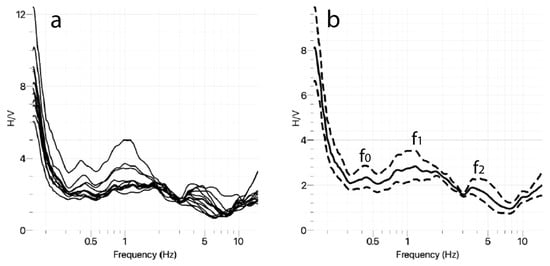 (a) HVSR plots for the 12 stations of the array; (b) an average of the HVSR values (Bazzano array); f0, f1, and f2 resonance frequencies can be noted for 0.4 Hz, 0.8–2 Hz, and 4–5 Hz, respectively.