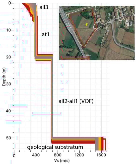 Also, for the Bazzano–Monticchio area, the data processing enabled us to reconstruct the Vs velocity profile, which highlighted four layers: A (0–8 m, Vs = 275 m/s), B (8–20 m, VS = 400 m/s), C (20–50 m, Vs = 680 m/s), and D (50–54 m, Vs = 1500 m/s) (Figure 9). Layer A corresponds to the all3 unit; B corresponds to the at1 unit, also based on the stratigraphic log of a nearby borehole; C corresponds to the deeper layers of all2 unit and all1 unit; and D corresponds to the geological substratum (Figure 9).
