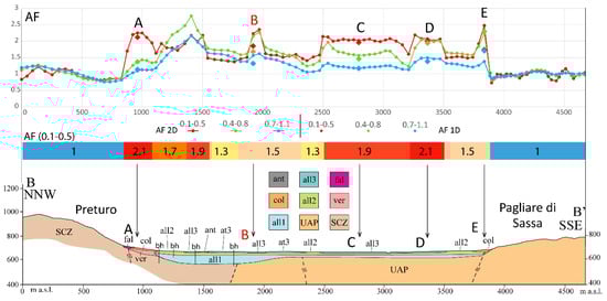 FA values, calculated through 2D modeling, for Preturo–Pagliare di Sassa area that is represented in section B-B’ (Figure 1). The diamond symbol refers to AF calculated with 1D simulation. The letters from A to E indicate the points of the section where the amplification factor was calculated with 1D modeling. bh: boreholes; SCZ and UAP: calcareous and terrigenous units belonging to the seismic bedrock; the other units refer to the Plio–Quaternary basin-filling detrital units (Table 1, Table 2 and Table 3). AF intervals: Class 1.0: AF < 1.05; Class 1.1: 1.05 ≤ AF > 1.25 (not present); Class 1.3: 1.25 ≤ AF > 1.45; Class 1.5: 1.45 ≤ AF > 1.65; Class 1.7: 1.65 ≤ AF > 1.85; Class 1.9: 1.85 ≤ AF > 2.05; Class 2.1: 2.05 ≤ AF > 2.25; Class 2.3: 2.25 ≤ AF > 2.45 (not present).