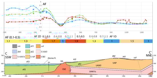 In the Bazzano–Monticchio area represented in section C-C’ (Figure 1), the AF values, calculated through 2D modeling, increase for the intervals of the higher periods, i.e., a shift of the seismic energy towards higher periods is noted (lower frequencies). The diamond symbol refers to AF calculated also with 1D simulation. bh: boreholes; lds: landslide; CBZ and UAM3, UAM1b, UAP: calcareous and terrigenous units belonging to the seismic bedrock; the other units refer to the Plio–Quaternary basin-filling detrital units (Table 1, Table 2 and Table 3). AF intervals: Class 1.0: AF < 1.05; Class 1.1: 1.05 ≤ AF > 1.25; Class 1.3: 1.25 ≤ AF > 1.45; Class 1.5: 1.45 ≤ AF > 1.65; Class 1.7: 1.65 ≤ AF > 1.85; Class 1.9: 1.85 ≤ AF > 2.05.