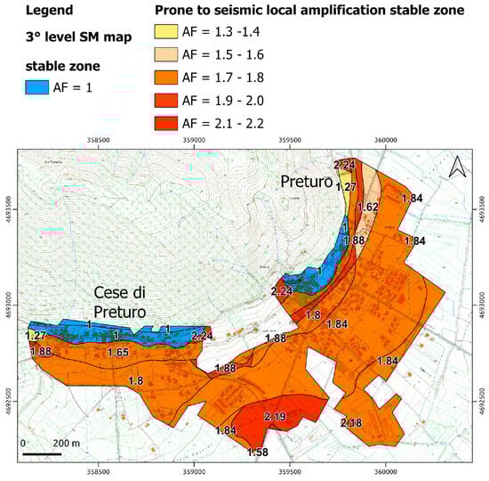 In Figure 12, as an example, the third-level SM map of Preturo is reported for the period interval of 0.1–0.5 s.