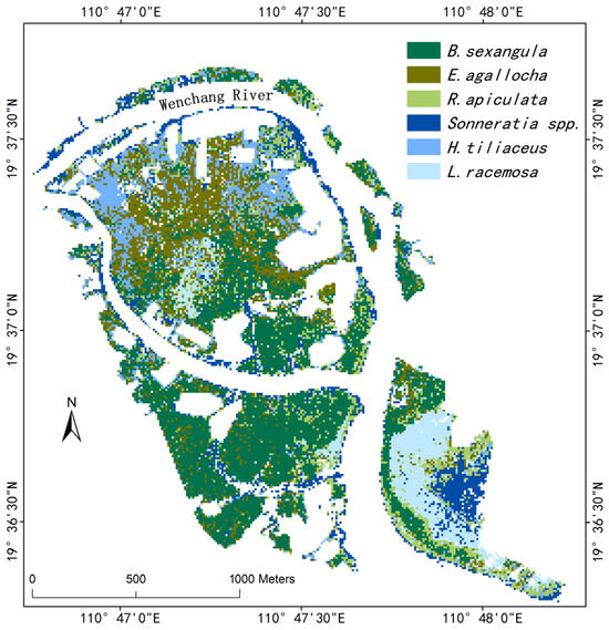 - Mangrove plant species. The mangrove plant species in the study area were primarily divided into five species and one genera: B. sexangula (BS), E. agallocha (EA), R. apiculata (RA), H. tiliaceus (HT), and L. racemosa (LR), Sonneratia spp. (SS, including S. alba, S. apetala, and S. ovata). UAV ortho imagery with 0.06 m spatial resolution was used, and supervised classification was performed using the support vector machine, minimum distance method, and maximum likelihood method. The results from the maximum likelihood method that had the highest classification accuracy and Kappa coefficient were selected. These results were then combined with field investigation data, UAV aerial photography, and historical data to manually refine the supervised classification results, resulting in the spatial distribution map of mangrove plants in the study area (Figure 2), with a modified classification accuracy of about 87% (Table 1).