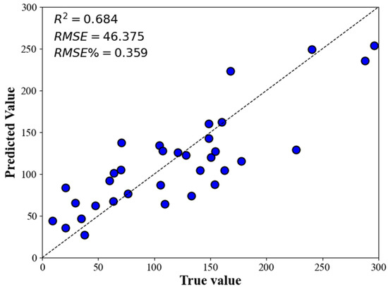 - Biomass data. The AGB and the density of each quadrat were estimated based on 116 quadrat data collected from June to August in 2022 and 2023 and known mangrove AGB allometry equations. The data were split into a 7:3 ratio for the training set and validation set. Using a two-order model, mangrove height and canopy were first extracted by LiDAR. Then, the tree height and canopy of the full coverage area of the study were retrieved using spectral characteristic variables, polarization characteristic variables, and texture information from Sentinel-2 and Landsat. Finally, tree height, canopy, and image spectral characteristics were combined. The inverse model of mangrove AGB was constructed using a random forest regression algorithm. The optimal inversion results have an R2 of 0.68 and an RMSE of 43.375, indicating good accuracy (Figure 3). Applying the optimal model to the entire study area, the mangrove AGB map for the whole area was obtained.