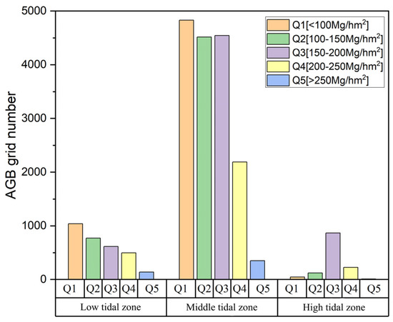 - The spatial analysis of mangrove AGB revealed significant local clustering, with “high–high” hotspots mainly in the southwest and northeast and “low–low” coldspots in the central and southeastern regions, identifying key areas for potential mangrove quality improvement.
