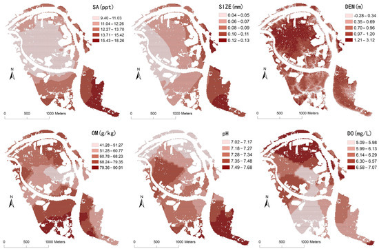 - Soil and water environment data. Soil factors included organic matter, total nitrogen, total phosphorus, total potassium, and particle size, while water environment factors included pH, salinity, and dissolved oxygen. Field sampling of 67 soil sites and 79 water sites was completed in the Bamwan Area from 2021 to 2022 (Figure 1). The pH, salinity, and dissolved oxygen of water were determined on-site, and the soil organic matter, total nitrogen, total phosphorus, total potassium, and particle size were measured using the potassium dichromate volumetric method, Kjeldahl method, alkali melt-molybdenum-antimony resistance spectrophotometry, atomic absorption spectrophotometry, and laser particle size analyzer, respectively.