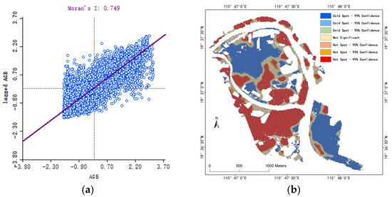- Moran’s I: The global Moran’s I coefficient was used to describe the overall correlation degree of regions and to reflect the overall spatial agglomeration characteristics. The calculation formula is as follows [44]:where I is the global autocorrelation index; and are the index values of attribute unit and are the mean values; and is a spatial weight matrix, which reveals the spatial differentiation of mangrove AGB. Moran’s I ∈ [−1, 1], where I < 0 indicates that there is a spatial negative correlation between the observed values, and I > 0 indicates a spatial positive correlation.