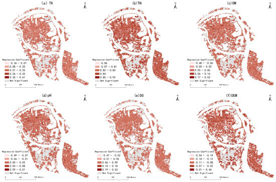- The main drivers of mangrove AGB spatial differentiation were identified through comprehensive analysis using geographic detectors and multiple regression models, considering single-factor effects, two-factor interactions, and multiple factors. Factors were ranked by their influence intensity from highest to lowest: TN > TK > DEM > DO > OM > pH. TN exhibited the strongest effect on AGB (0.832), followed by TK, while pH had the least effect. TK, TN, OM, pH, and DO were positively correlated with mangrove AGB, promoting its growth. Conversely, DEM exhibited a negative correlation with AGB, indicating an inhibitory effect.