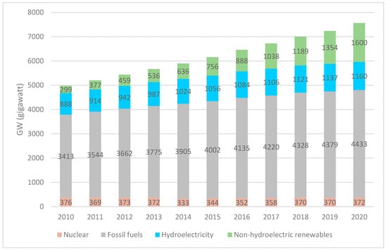 Installed electricity capacity worldwide (2010–2020) [13].