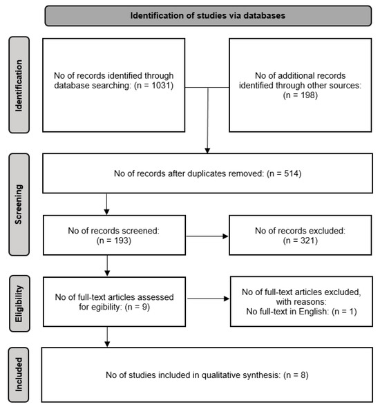 - Moher, D.; Liberati, A.; Tetzlaff, J.; Altman, D.G. Preferred reporting items for systematic reviews and meta-analyses: The PRISMA statement. BMJ 2009, 339, b2535. [Google Scholar] [CrossRef]