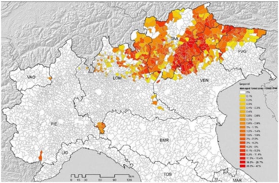 In 2018, an extratropical cyclone named Vaia struck northern Italy, bringing heavy precipitation and strong winds. It caused extensive infrastructural, environmental, economic, and psychosocial impacts, making it one of the most impactful events on Italian forest ecosystems [15,16]. The storm originated from a deep meteorological depression which impacted northern Italy between 27 and 30 October 2018. The low point was on 29 October, with gale force winds and violent storm surges in the upper Adriatic and excessive rainfall in the eastern Alps, where the wind reached peaks of more than 200 km/h. The most affected regions were Trentino Alto Adige and Veneto, followed by Lombardy, Friuli Venezia Giulia and, limitedly, Piedmont and Valle d’Aosta. Regarding forest damage (see Figure 1 and Figure 2), it is estimated that the Vaia storm significantly damaged around 42,500 ha of forest area distributed across 494 municipalities, with around 8.5 million m3 of trees being uprooted [15]. It also caused flooding, landslides, static instability, general blackouts, and problems with the distribution of electricity and gas, interrupted telephone lines, and widespread damage to structures and infrastructure, including household damages, i.e., the destruction of homes, roofs, and the loss of personal belongings. The storm resulted in an estimated economic loss of approximately EUR 2.6 billion, encompassing recovery and restoration efforts, timber value, and the broader repercussions on the forestry sector and related industries [17,18].