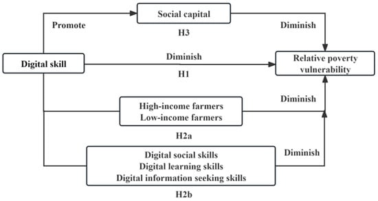 The widespread adoption of modern digital technologies has expanded farmers’ social networks in unprecedented ways. Digital technology provides farmers with convenient real-time communication channels, reducing both time and communication costs, while reinforcing existing strong relationships. It also creates opportunities for establishing new, weaker social ties [59,60]. This new social capital accelerates information sharing, allowing farmers to rapidly access information, communicate, learn, and support one another in times of risk, thereby reducing their vulnerability to poverty [61]. Consequently, enhancing the digital skills of farm households can further expand their social networks, thereby reducing the risk of future poverty (see Figure 1). We propose the following research hypothesis:
