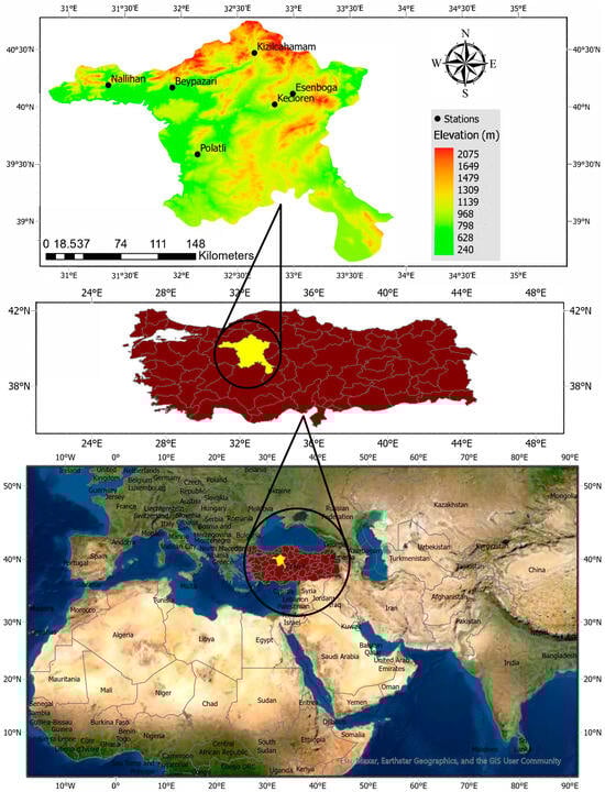 Ankara, the capital province of Turkey, is situated in the central north part of the country, at the coordinates of 39.875° N 32.8333° E (Figure 1). With an elevation of 850 m (2800 feet) above sea level, the city covers a vast area of 24,521 square kilometers (9468 square miles). Ankara has a cold semi-arid climate, characterized by cold, snowy winters and hot, dry summers, and is home to a population of over 5,500,000 people, making it a significant urban center in Turkey. The province has a crucial location for hydrological studies due to its semi-arid climate and vulnerability to climate change, droughts, and water scarcity. As a hub for agriculture, effective water management is essential to ensure sufficient water supply for municipal, industrial, and agricultural purposes in the province.