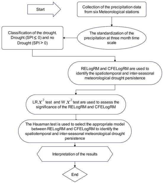 As illustrated in Figure 2, advanced BOPD models, specifically RELogRM and CFELogRM, were used to analyze the complicated STIS aspects of drought occurrences and to understand the complex dynamics of drought persistence, variability, and transitions across the study area. Furthermore, the LR χ2 and W χ2 were used to evaluate the significance and robustness of the RELogRM and CFELogRM.
