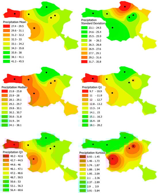 The present analysis employs data from six stations in Ankara Province, wisely selected based on the availability of complete monthly records spanning 52 years. A comprehensive overview of the precipitation characteristics, including mean, standard deviation, median, quartiles, and kurtosis, is presented in Figure 3. In addition, Table 1 specifies a detailed summary of the precipitation characteristics together with the geographical coordinates (elevation, latitude, and longitude) of each station, offering a thorough understanding of the spatial and temporal patterns of precipitation in the region.