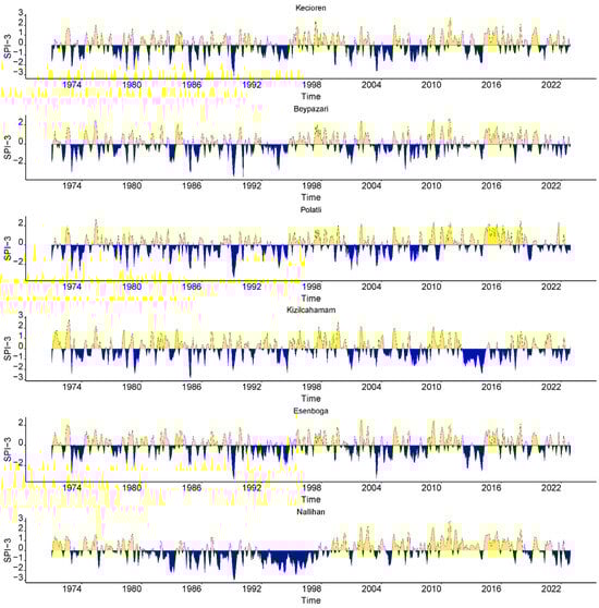 The highest value for precipitation was seen at Kizilcahamam with an average of 45.47 mm, and the lowest precipitation was observed at Nallihan station with a mean of 27.29 mm. The other characteristics of precipitation for each station can be observed accordingly. To attain the MD index on a three-month time scale, the SPI package in the R library was used. In the calculation of SPI-3 at each station, first, the three-month precipitation records are aggregated, and then, Gamma distribution is fitted to the aggregated time series. Ultimately, the cumulative probability gamma function undergoes transformation into a standard normal random variable Z, characterized by a mean of 0.0 and a standard deviation of 1.0. This transformation is executed to align each month’s aggregated precipitation in the gamma function with a corresponding value in the new Z function, denoted as SPI-3.