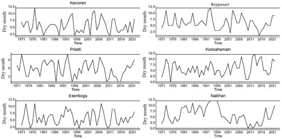 Time variation in drought events at each station. It highlights the annual maximum and minimum drought frequency. In this case, the station in Kecioren faced maximum and minimum drought events of 12 and 2, respectively, over the period from January 1971 to December 2022, delivering insights into the irregularity of drought events at each station.