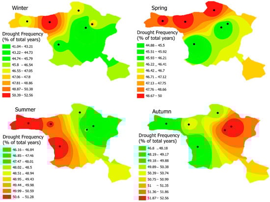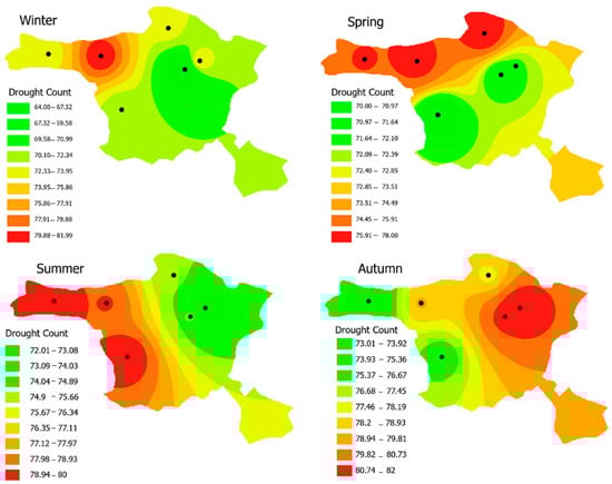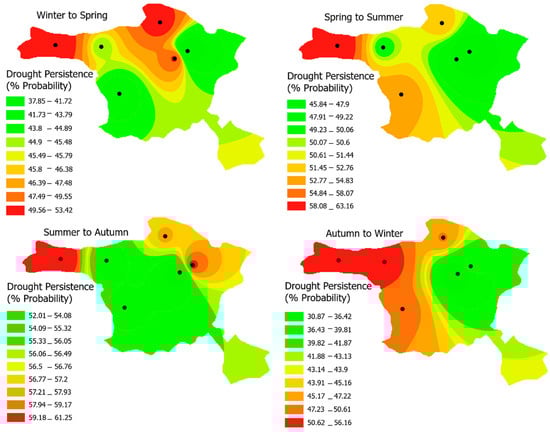 The well-known Inverse Distance Weighting approach was applied to calculate the drought counts in the non-selected area. In winter and spring, the drought counts are high in the northwest side of Ankara, while in the summer and fall season the drought counts are high in the southwest and east sides. To determine the seasonal frequency of drought events, the percentage of seasons with negative SPI-3 was calculated. Figure 7 illustrates how drought frequency varies by season. The drought frequency has a similar pattern to the drought counts. As suggested [], the drought persistence at the seasonal scale was computed by dividing the frequency of drought events during two successive seasons by the total number of dry events (SPI-3 0) in the previous season.