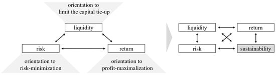 This traditional concept of the ‘magic triangle’ becomes more and more a ‘magic square’, taking the personal values and sustainability ambitions of the investor into consideration as an additional fourth dimension, as shown in Figure 1 [,]. The motives of this model are in conflict with each other. A high profit cannot be achieved without risk and without tying up capital, for example. The dimension of sustainability also plays a role in this conflict of motives. Sustainability has an impact on risk, profit, and liquidity. Vice versa, these variables also influence the investor’s personal and individual propensity for sustainability. The dimensions of the triangle model result in different investment motives; namely, the ‘orientation to profit-maximization’, the ‘orientation to limit the capital tie-up’, and the ‘orientation to risk-minimization’.