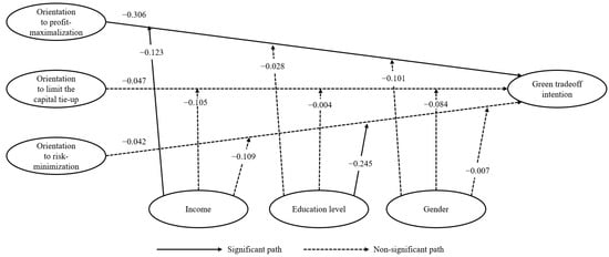 The independent variables of the model are derived from the motives concerning an investment decision described earlier; namely, the orientation to profit maximization, the orientation to limit the capital tie-up, and the orientation to risk minimization. The dependent variable is the green tradeoff intention. Each of the relationships between the independent variables and the dependent variable are moderated by the demographic aspects; namely, income, educational level, and gender. The path coefficients and an illustration of the research model are shown in Figure 2.