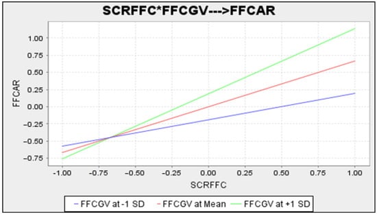 Similarly, Figure 4 illustrates the moderating effect of FFCGV on the relationship between SCRFFC and FFCFO. The pattern is consistent with that observed in Figure 3, where the slope increases as FFCGV rises. This indicates that the effect of SCRFFC on felt obligation is more pronounced among customers with higher green values. At +1 SD of FFCGV, the slope is steepest, showing that these customers are more likely to feel obligated to support sustainability efforts when exposed to sustainability communication. At lower levels of FFCGV (−1 SD), the impact of SCRFFC on FFCFO is weaker, reflecting a diminished sense of obligation among customers with lower environmental values.