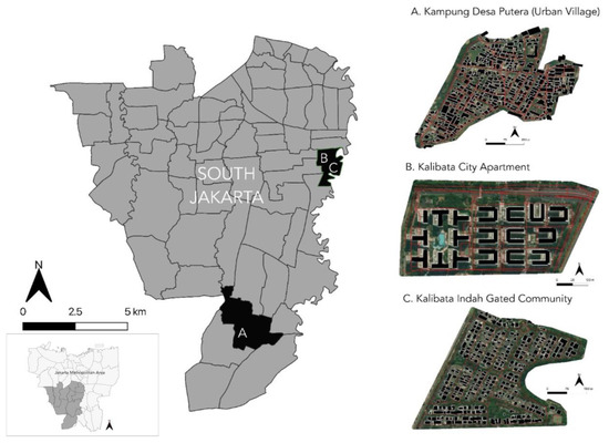 Locations of selected sample neighborhoods in Jakarta: (A). Kampung Desa Putera (urban village), (B). Kalibata City Apartment, (C). Kalibata Indah Gated Community. Insets display detailed Google Earth satellite imagery of each neighborhood.