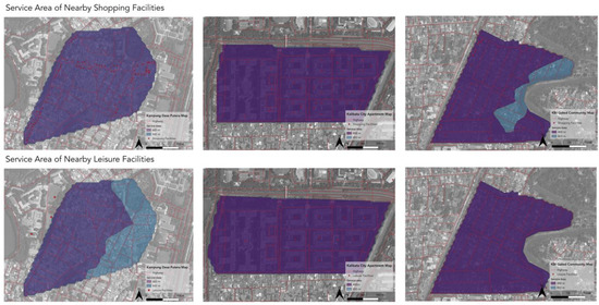 Lastly, we have included the urban and suburban gated community called Kompleks Perumahan in our study. Built by developers on a small plot of land and usually occupied by upper-middle-class households, this residential complex has limited facilities [71]. This study explored Perumahan Kalibata Indah in Pancoran District, South Jakarta; a residential complex of 482 houses built on 18 hectares of land in 1982. By 2020, Pancoran District had 25,269 men and 24,945 women, with a 101 sex ratio [69]. In Perumahan Kalibata Indah, with each unit containing an estimated 4 people, this study area may have approximately 2000 inhabitants. Additionally, Figure 2 depicts each study area’s nearest shopping and leisure facilities service coverage.