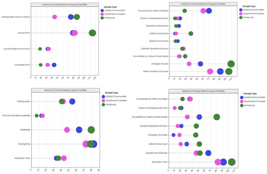 Over 60% of kampung respondents chose the nearest leisure activity for timesaving, with walking distance being the second most common reason. The women in the apartment complex and gated community preferred nearby activities for variety and attractions. Farther leisure spots were chosen for various attractive activities and quieter and greener surroundings. The women in the kampung favored accessibility to various travel modes, a wide range of activities, and better attractions; however, the women in the apartment complex and gated community valued more attractive activities and quieter environments. Most women preferred walking to nearby leisure spots, except the women the gated community, who have a more balanced preference for motorized modes. Commuting-mode preferences to reach farther leisure facilities vary across different dwelling types. The women in the kampung commonly used public transport for distant leisure, the women in the apartment complex used public transport and cars, and the women in the gated community were highly reliant on private cars. The findings indicate a correlation between dwelling type and leisure-trip preferences.