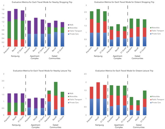 Figure 4 illustrates the predicted results for transportation modes using the most accurate predictive models for each residential type. For nearby shopping, the gated community model performed poorly in predicting public transport, motorbikes, and walking, with F1-scores of 0.67, 0.27, and 0.25, respectively. The kampung sets demonstrated compelling predictions only for motorbikes. In the apartment complex, predictions for private cars and walking were mediocre; however, motorbikes were not predicted due to an imbalanced dataset issue identified in the confusion matrix. The kampung models outperformed the others for distant shopping, maintaining moderate F1-score across travel modes. The public transport predictions were generally high, but the motorbike predictions were consistently low, particularly in the apartment complex. The model struggled with close leisure mode preferences, accurately predicting walking in the kampung and apartment complex but failing in the gated community. Similarly, it failed to predict motorbike usage in apartment sets. The private car predictions were relevant only for the apartment complex and gated community, with moderate F1-score. The public transport predictions ranged from poor in the kampung to excellent in the gated community; however, motorbike predictions were consistently mediocre. The kampung sets exhibited the highest predictive performance for private and public transport, with private cars significantly outperforming other modes. The predictions for the apartment complex and gated community were consistently mediocre, averaging an F1-score of 0.5. The model’s effectiveness in predicting the transportation-mode choice for shopping and leisure varied significantly among residential types, likely due to complex travel habits, insufficient data, and imbalanced test populations.