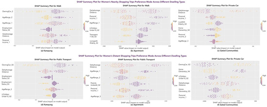 Key features interact to determine women’s commuting-mode choices for nearby shopping trips, as illustrated in Figure 7. Car ownership and living alone decrease the likelihood of walking in kampung settings, as indicated by the spread of dots in the negative SHAP value region. Longer commutes and being between the ages of 27 and 36 reduce walking inclination in apartment settings; however, adverse scenarios mitigate this effect. The combination of commute patterns and living arrangements in gated communities considerably impacts transportation choices. Longer commutes often increase private car use; however, this tendency is less noticeable for those residing in their parents’ or in-laws’ houses. Car ownership, commute distance, and living arrangements all substantially impact mobility options for distant shopping trips across different dwelling contexts. In kampung settings, public transport usage decreases among non-car owners; however, this effect is mitigated for individuals with more extended residency, as evidenced by the yellow dots on the plot’s right side, indicating a positive SHAP value. In apartment settings, public transport usage decreases among women with longer commutes and living with none of those mentioned factors; however, the reverse scenario shows the opposite effect. The distribution of dots in the positive SHAP value on the right side of the plot demonstrates how car ownership and the presence of children positively influence private car use in gated communities.