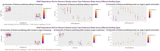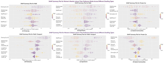 Figure 8 shows that the interaction of key features has diverse effects on predicting transportation choices for nearby leisure trips in various dwelling settings. Walking is less likely in kampung settings among high-income women without cars. However, the opposite scenario decreases the likelihood of walking. In apartment settings, women aged 37–46 with longer commuting distances are less likely to walk; however, the reverse scenario demonstrates a higher inclination towards walking. A longer commute-distance interaction with a low income generally decreases private car usage in gated community settings, but this trend is less pronounced for those with a middle-high income. The interplay of daily commute distance, car ownership, marital status, and living arrangement factors causes a difference in predicting the distant leisure-trip preference mode. Car ownership and longer commutes reduce the chances of using public transport in kampung settings. In apartment settings, women aged 18–26 living with teenagers are less likely to use public transport; however, those in the opposite scenario demonstrate increased usage. In gated communities, private car usage increases among married women and those with longer commutes. In comparison, the interaction between shorter commutes and being married shows the opposite effect. These findings underline the necessity of considering many interconnected variables when examining transportation options, since these interactions may produce complicated and often contradictory results across diverse dwelling contexts.