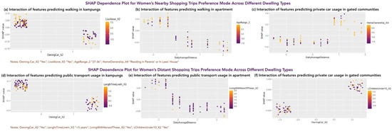 Our findings indicate the nonlinear interaction effects among key features on positive and negative Shapley values, as illustrated in the SHAP dependence plot. Each dot represents a data row. The horizontal position represents the dataset value; however, the vertical position of the dots illustrates how it affected the prediction. Positive and negative SHAP values imply positive and negative impacts, respectively. To further clarify these interactions, we use color coding: yellow represents high values or “Yes” responses; however, purple denotes low values or “No” responses. Figure 7 and Figure 8 illustrate the interaction effect of key features on predicting nearby and distant non-working-trip preference modes based on the dominant mode women prefer in each dwelling type. The comprehensive SHAP dependence plot of the remaining preference mode across the dwelling types is presented in Appendix B, Figure A6, Figure A7, Figure A8, Figure A9, Figure A10, Figure A11, Figure A12, Figure A13, Figure A14, Figure A15, Figure A16 and Figure A17.