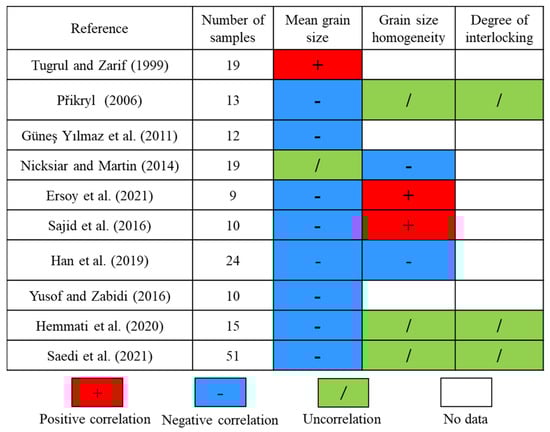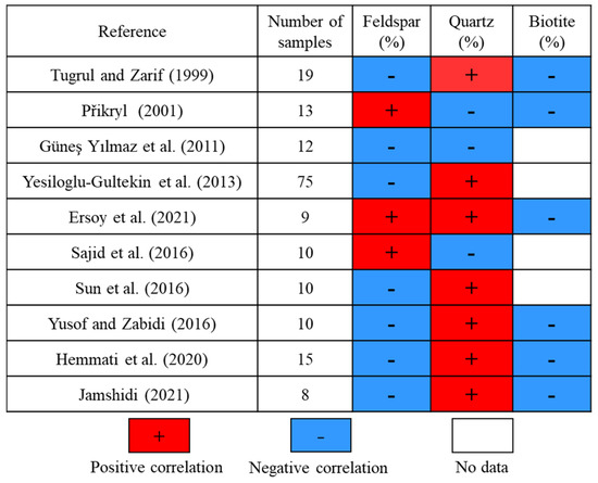 The following is an example of granitic rocks: The main minerals of granitic rocks include quartz, plagioclase, and K-feldspar, and they also contain certain amounts of dark minerals such as biotite or hornblende. Since K-feldspar and plagioclase are only slightly different in chemical composition, their crystal structures and physical properties are similar. Therefore, they can be unified as feldspar to study their mechanical properties [12]. Figure 1 shows the relationship between the mineral composition of granitic rocks and their UCS from previous studies. The red regions show a positive correlation, the blue regions show a negative correlation, and the white regions indicate the absence of data. As can be seen from Figure 1, the previous studies have shown that there is a significant correlation between feldspar, quartz content, and UCS. The disagreement lies in whether they are positively or negatively correlated with UCS. In addition, there are also disagreements about the relationship between biotite and UCS, with some studies suggesting a negative correlation and others suggesting no relationship. However, regardless of the relationship between minerals and UCS, it has been shown that the mineral composition of rocks has a significant effect on their UCS.