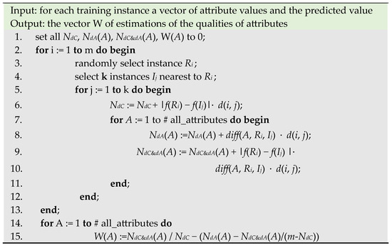 W(A) can be estimated by combining the above Equations (1)–(4). This can be achieved by the algorithm in Figure 3 [42], where NdC is the weight for different prediction, NdA(A) is the weight for different attribute, and NdC&dA(A) is the weight for different prediction and different attribute. The final estimation of each attribute W(A) is computed in lines 14 and 15.