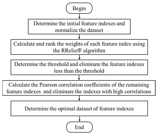 In summary, the RReliefF algorithm can calculate the contribution of each feature index to the prediction of rocks’ UCS, and the Pearson correlation coefficient can determine the degree of correlation between each feature index. Combining the two, the features with larger feature weights and weaker correlation with other features can be retained, thus completing the selection of the optimal feature combination. The flow of the RReliefF–Pearson feature selection method proposed in this study is shown in Figure 4.