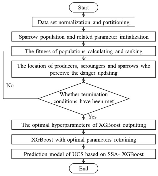 - SSA-XGBoost model construction: Using the global optimization ability of the Sparrow Search Algorithm, the hyperparameters of XGBoost were continuously optimized iteratively in the set search space to acquire the optimal hyperparameter combinations, so as to establish the optimal SSA-XGBoost UCS prediction model.