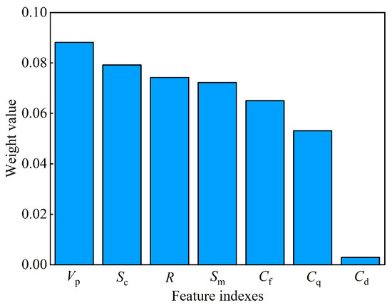 In this study, the number of nearest neighbors was taken as 10, and the calculation was repeated 30 times. The final weight values of the feature indices and the ranking by weight value from largest to smallest are shown in Figure 6. The larger the weight values of the feature indices, the more favorable the feature indices are for predicting the rock’s UCS, so the weight values should be as large as possible and the number of feature indices should not be too small. From Figure 6, it can be seen that the weights of the longitudinal P-wave velocity, sorting coefficient, rebound value, mean grain size, feldspar content, and quartz content were larger and more than 0.5, while the weight of the dark mineral content was only 0.003, which is much smaller than the weights of the other feature indices. Therefore, the dark mineral content was removed, and the other six feature indices were preliminarily selected, including feldspar content, quartz content, mean grain size, sorting coefficient, rebound value, and P-wave velocity.