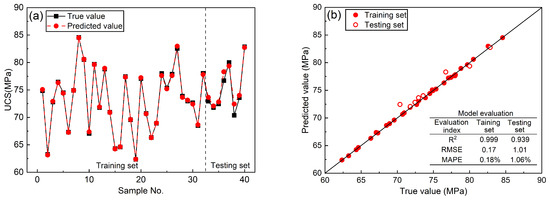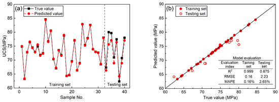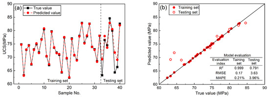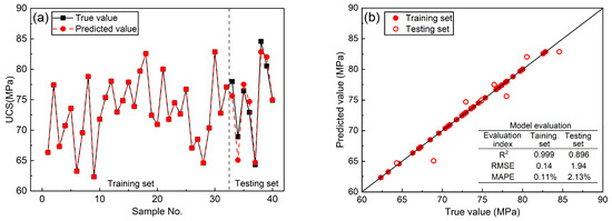 Figure 11 shows the training and prediction results of the SSA-XGBoost UCS prediction model based on physical parameters. As can also be seen in Figure 11a, the predicted values and true values of this prediction model were also closer on the training set, and there was still a significant deviation between the predicted values and true values on the testing set. According to the evaluation indices in Figure 11b, R2 is also above 0.99, the RMSE is 0.17, and the MAPE is 0.21%, which is essentially the same performance as the previous two models on the training set. On the testing set, R2 is 0.791, the RMSE is 3.63, and the MAPE is 3.96%. Compared with the first two models, the model trained with only two predictors (rebound value and P-wave velocity) had the worst generalization ability. Compared with the previous two prediction models, the gap between the performance of this model on the testing set and its performance on the training set is larger, indicating that the overfitting of the model is more serious.