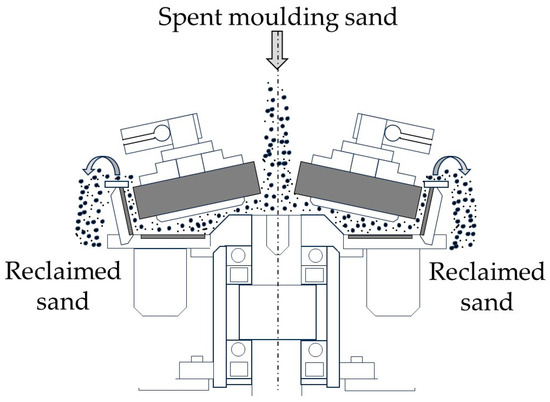 The most popular method, due to cost, for recovering the grain matrix from spent moulding and core sand is mechanical regeneration. The work [26,27,28,29,30,31,32,33,34,35,36] presents issues related to mechanical regeneration. As studies show, it is not a fully waste-free process. Mechanical interactions produce significant amounts of dust, consisting of the binder used and the fine grain matrix fraction produced by its crushing if the equipment exerts an impact on the grain matrix that is too intensive [37]. This has the effect of reducing the yield of the processed material.